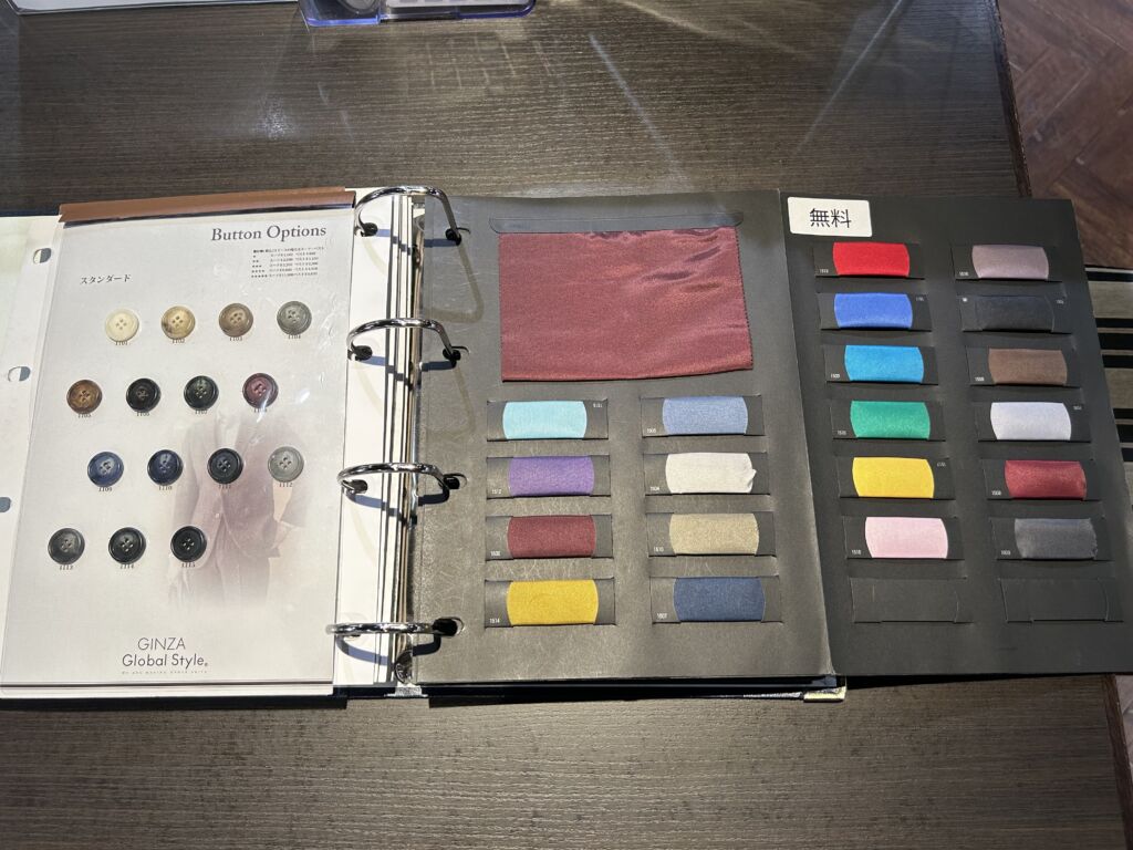 その後、裏地やボタンなどの細かい部分を選びます。ここはこだわることも、シンプルにまとめることも可能です。初めての方にはバランスの良い組み合わせをご案内しています。