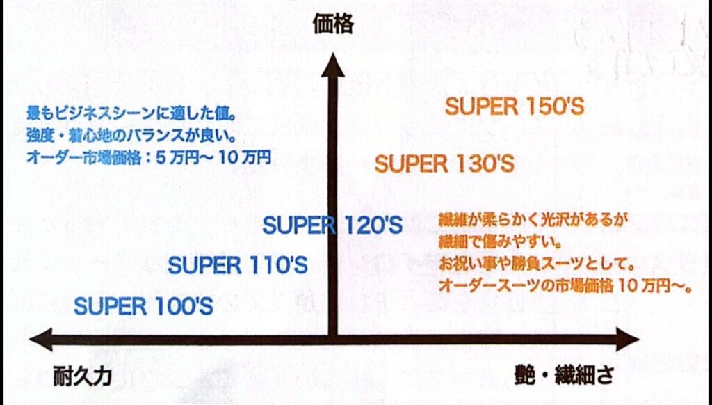 スーツを着始めたばかりの方、スーツを作りたい方は「Super100’s」「Super150’s」といった表記を一度は目にしたことがあるのではないでしょうか。