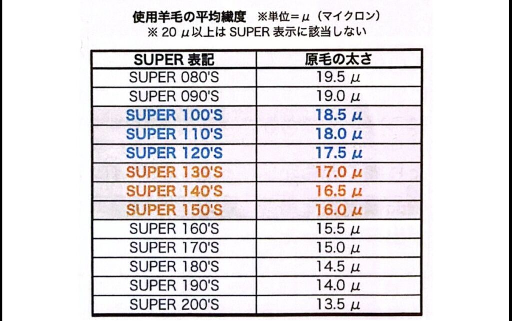 Super表記とは、ウールの「繊維の細さ」を表す指標です。