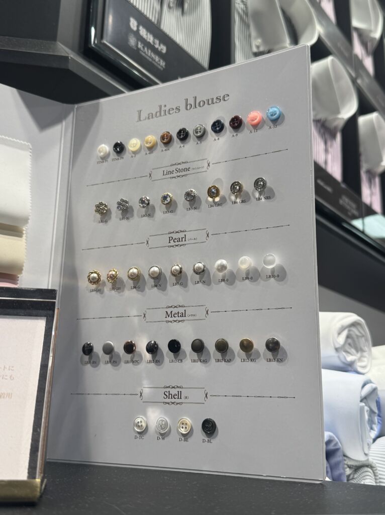 ボタンはカラーボタン、ラインストーン、パール、メタル、貝など多数種類をご用意しております。