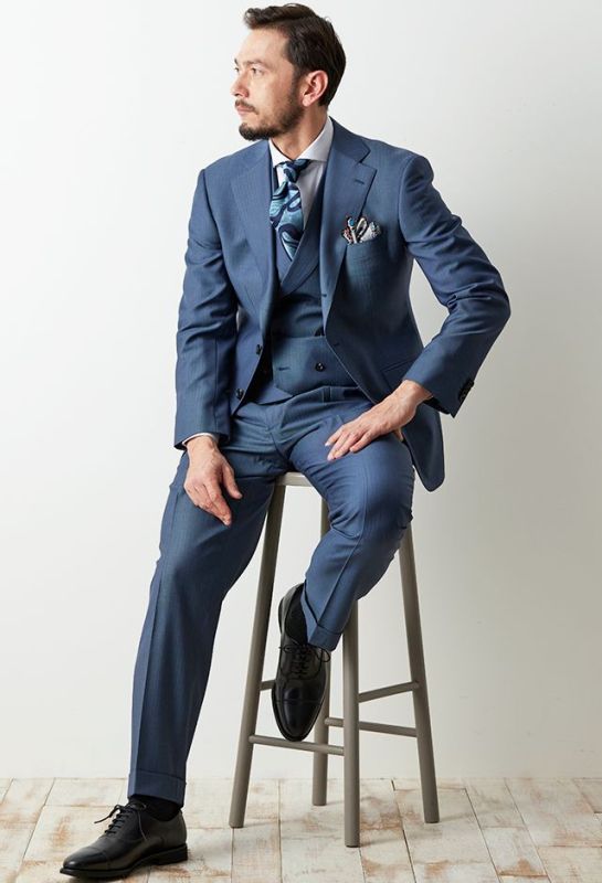 ブルーグレーのスーツは、青の爽やかさとグレーの落ち着きを兼ね備えた絶妙なカラーです。