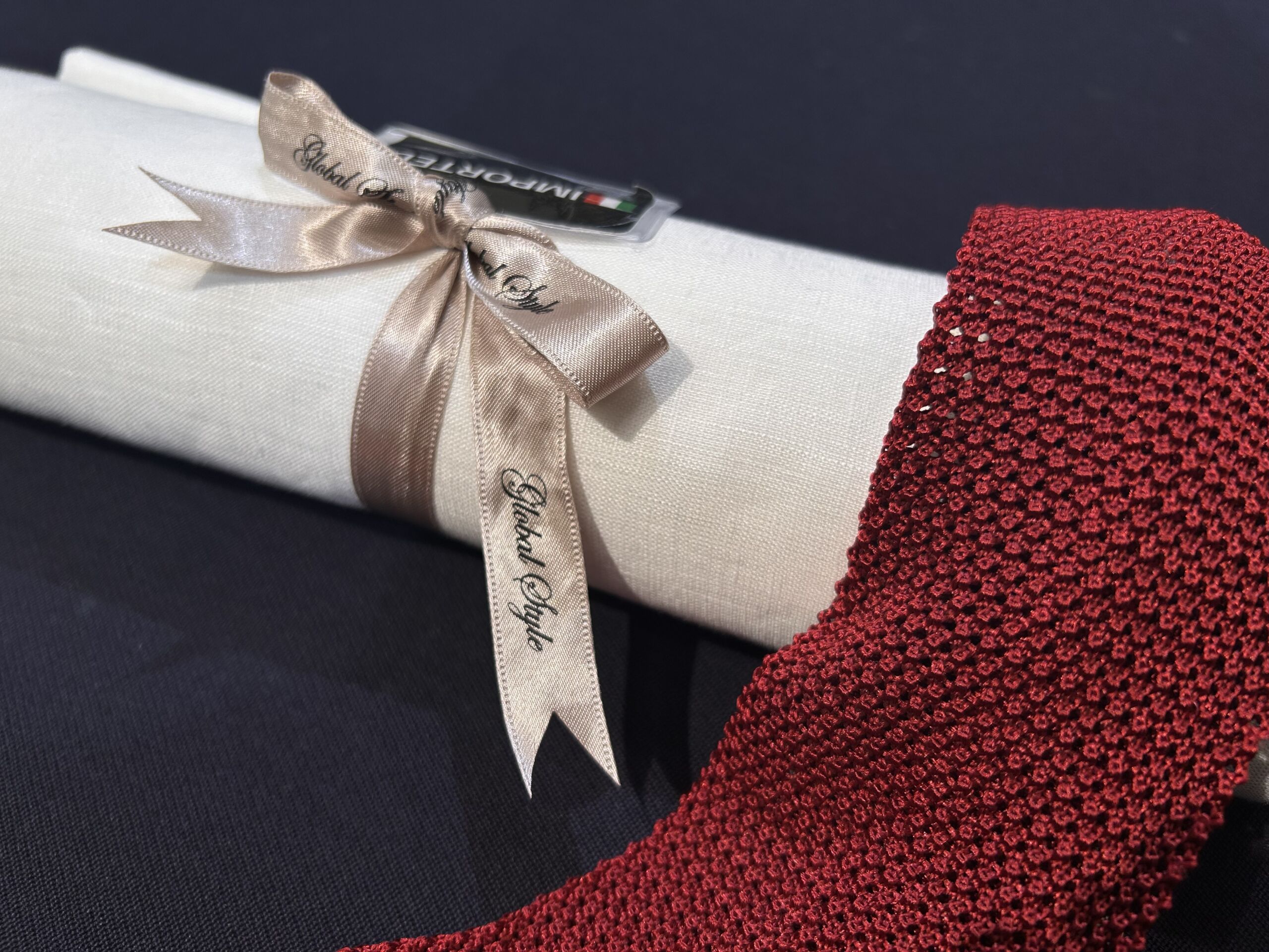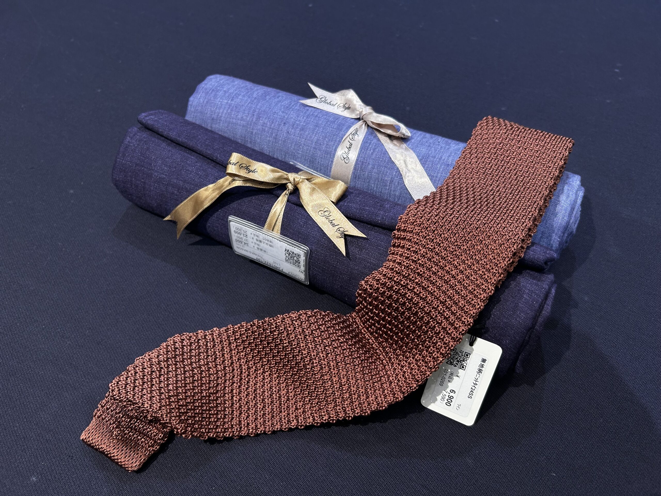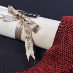 お次にニットタイ。ニット素材で作られているネクタイです。リネンシャツの涼しげな見た目ととても相性がよくかわいいですよね!