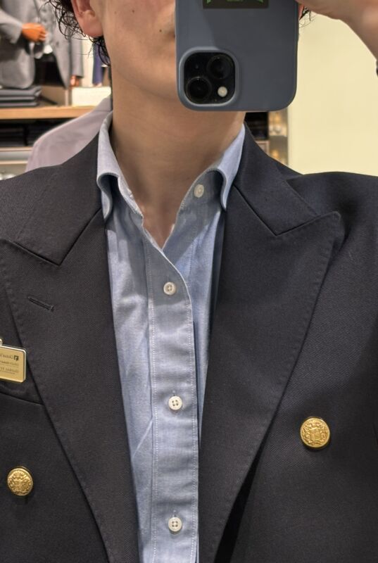私が着用している襟型は、ワンピーススナップボタンダウンになります。