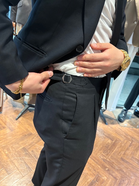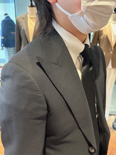 久保副店長はシングルジャケットにピークドラペル(先が尖ったタイプの衿)