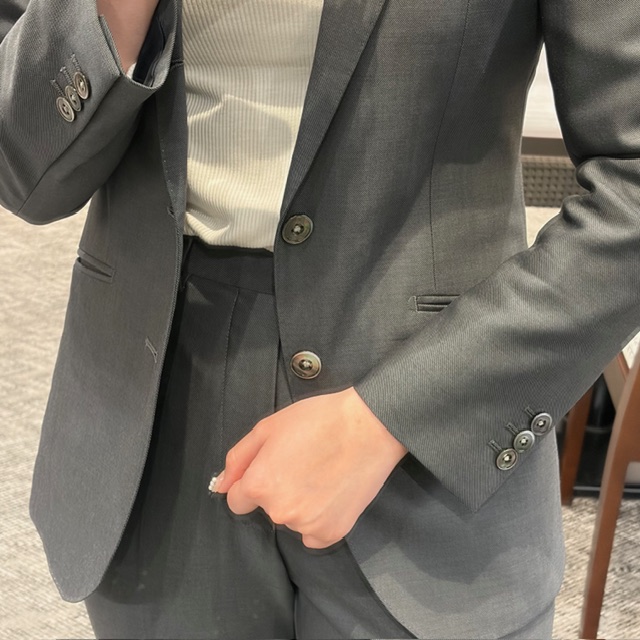 パット見は普通のグレーなんですがブラックに光る貝釦との相性も良く、