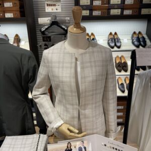 今回の一着は、ホワイトを基調とした上品なチェック柄。爽やかで清潔感のある印象を与え、オンにもオフにも活躍する万能アイテムです。