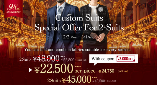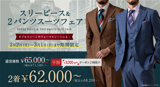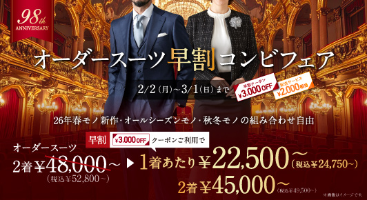 《当日来店OK!》早割&配送クーポン付!オーダースーツ2着45,000円(税込49,500円)~