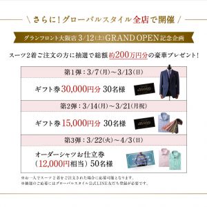 ブログをご覧の皆様、こんにちは! 銀座本店の黒木です。 今回はタイトルにある通り、お得なキャンペーンのお知らせです!! 明日、3月12についに、グランフロント大阪店がGRAND OPENいたします!!! それを記念して、3月7日から ...