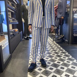 こんにちは。京都四条店吉田です。 本日は、武藤さんがド派手なスーツを着用しておりましたのでご紹介を、、、 それがこちら、、、 爽やかなブルーとホワイトのボールドストライプのダブルスーツになります。 ...