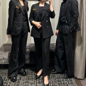 こんにちは なんばスカイオの高山です 9月6日、黒の日ということで 黒色スーツで合わせてみました 三者三様のシルエットで面白いですね 左の濱田さんは緩いジャケットとフレアパンツでメンズライクながらも女性らしさが残る ...