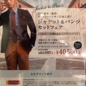 みなさんこんにちは。 今日で3月も終わりだというのになんか寒い日が続きますね…。 マフラーと冬物コートがまだ大活躍中の佐々木です!! 明日から新年度の始まりです!! 気分だけは暖かくしていきましょう!! 大好評の早割フェアも4/2㈰迄!! スーツの仕上がり日を ...