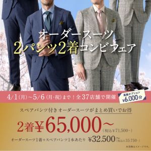 皆様こんにちは 皆様いかがお過ごしでしょうか 本日は新しいフェアのご紹介をさせて頂きます オーダースーツ2着コンビフェア! 組み合わせ自由な本格オーダースーツに二着同時購入頂くと今だけなんと高級オプション5000円分 ...
