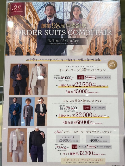 皆様こんにちは! 本日は、1月のフェアを紹介いたします! 2着コンビでは、¥3,000 OFFクーポンご利用で、1着当たり¥22,500~ 2着¥45,000~となっております! 3着コンビでは、1着当たり¥22,000~ 3着合計66,000~となっております! ...