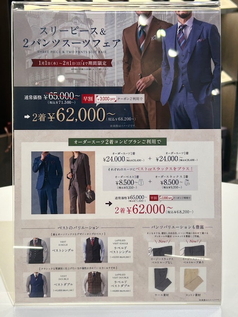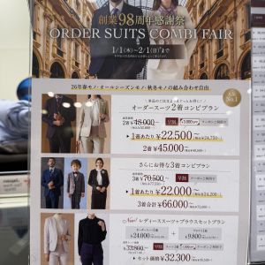 皆様こんにちは! 本日は、今月のフェアを紹介いたします! スリーピース&2パンツスーツフェアの紹介です! オーダースーツ2着コンビプランのご利用で オーダースーツ1着¥24,000~+オーダースーツ1着¥24,000~、 ...