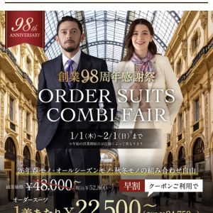 皆様こんにちは!! 今日からあと3日間で1月のフェア創業98周年感謝祭 オーダースーツコンビフェアが終わってしまいます!! LINEのクーポンでスーツ2着で3,300円引き!! スーツが3着で6,600円 ...