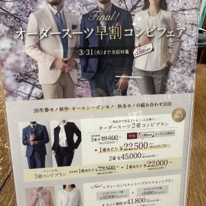 皆さんこんにちは! 表参道店の田宮です! 4月に向けたイベント用のスーツはご用意できてますか? 入学式や新入社員、昇進昇格による気持ちの切り替えなど 今月中にご納品が出来ます! ※お選びいただく生地によってご納期は異なります。 ...