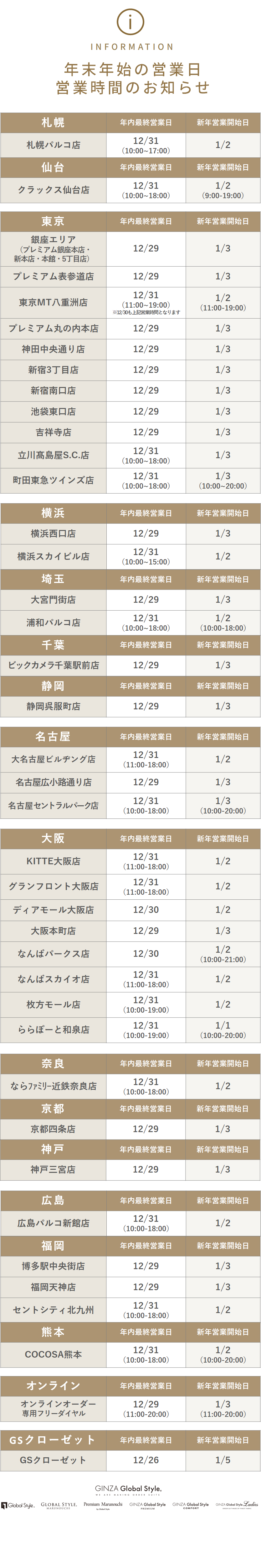 2025年末~2026年始の営業日及び営業時間は上記のとおりとさせていただきます。 ご来店・お引き取りの際には、ご注意頂きますようお願い申し上げます。 皆様のご来店をスタイリスト一同、心よりお待ち致しており … 続きを読む 【年末年始の営業日について】
