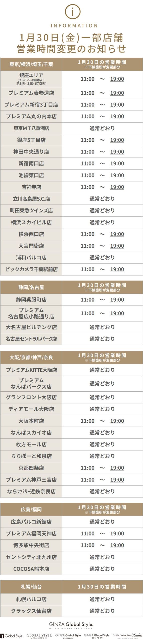 1/30(金) 一部店舗|閉店時間変更のお知らせ