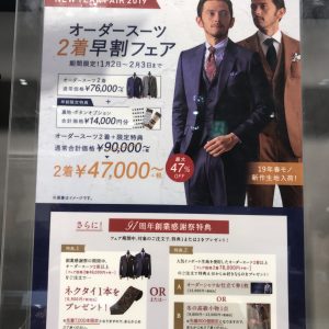 みなさんこんにちは。 早速ですがみなさん、今大人気のグローバルスタイルにて、大人気のフェアを開催中であることをご存知でしょうか。 それが「早割」です。 オーダースーツを2着お仕立て頂くと釦と裏地やが14,000円分無料となるなど、最大47%もお得になるフェアの事です ...