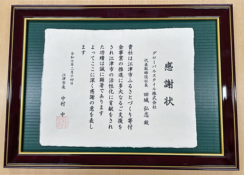 この度、その功績を評価され、島根県江津市長より感謝状を賜りました。