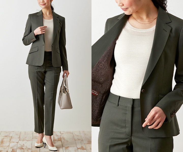 「堅実さ」「癒し」「穏やかさ」などのイメージあるカーキ(グリーン)。明るい色・暗い色の両方とマッチし汎用性が広がります。上品で明るめなブラウンの無地のスーツに、カーキのUネックニットで、デコルテラインを綺麗に仕上げています。彩りと首元のバランスのとれたコーデです。