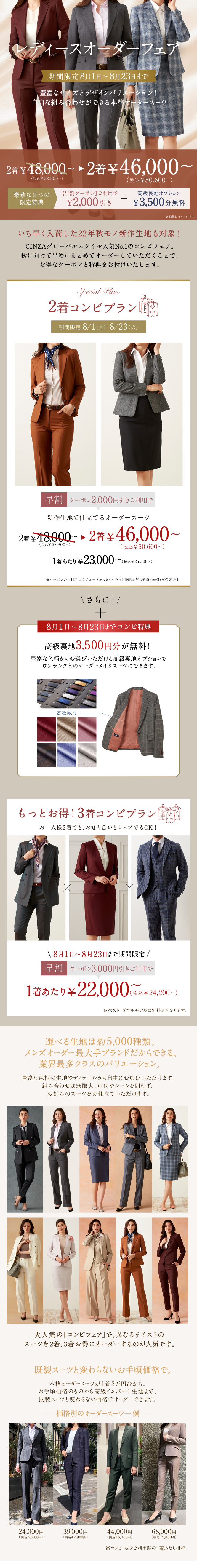グローバルスタイルのレディースオーダースーツ生地グローバルスタイルでは、2着以上同時に購入で「コンビ価格」というお得な値段が適応されます。