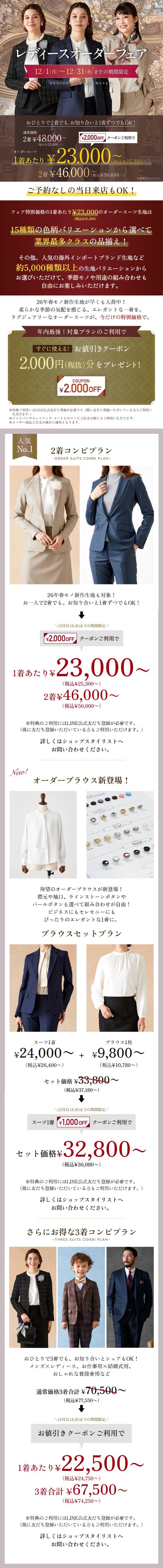スーツ1着2万円台~、5,000種類以上の豊富な生地、専用個室ありなど充実したサービス内容が魅力的。