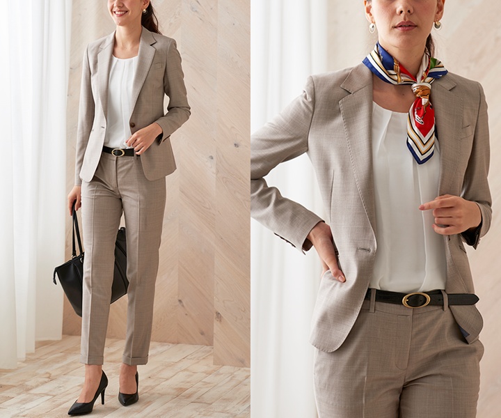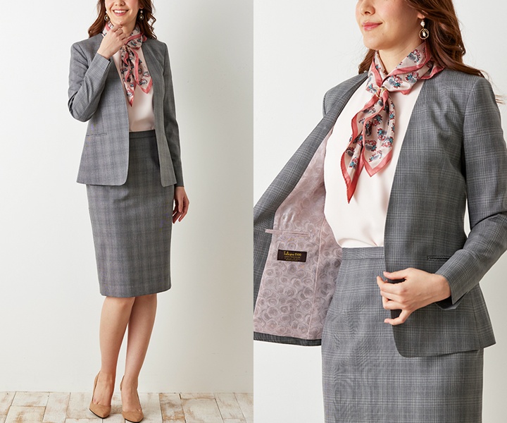 ライトグレーの生地にチェック柄が入ったスタイル。堅すぎない柔らかな雰囲気を醸しだします。ジャケットはノーカラーモデル、ボトムスは定番のタイトスカートですっきりとした印象になります。ピンク系のブラウスとスカーフの組み合わせが、女性らしく優しい印象をプラスします。