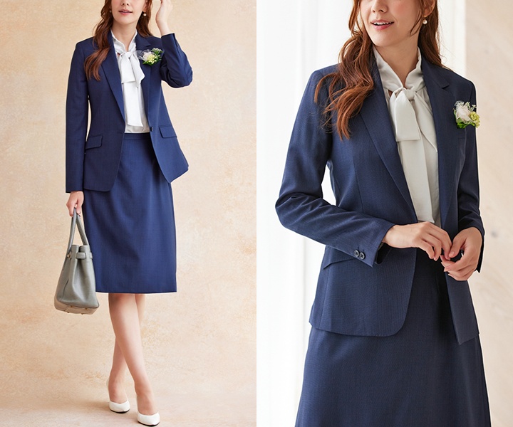 同じくネイビーカラーのスーツに、温かみのあるフランネル素材のスタイルで季節感を意識したスタイル。インナーには、白で統一したシャツ×ニットで、胸元の印象をフォーマルにまとめています。ジャケットは、すっきりとしたノーカラーモデルとなり、ボトムスには、テーパードパンツでアクティブな印象に。柔らかみのある装いは、子供を引き立てる効果も発揮できます。ジャケットを脱いでも清楚な雰囲気になります。