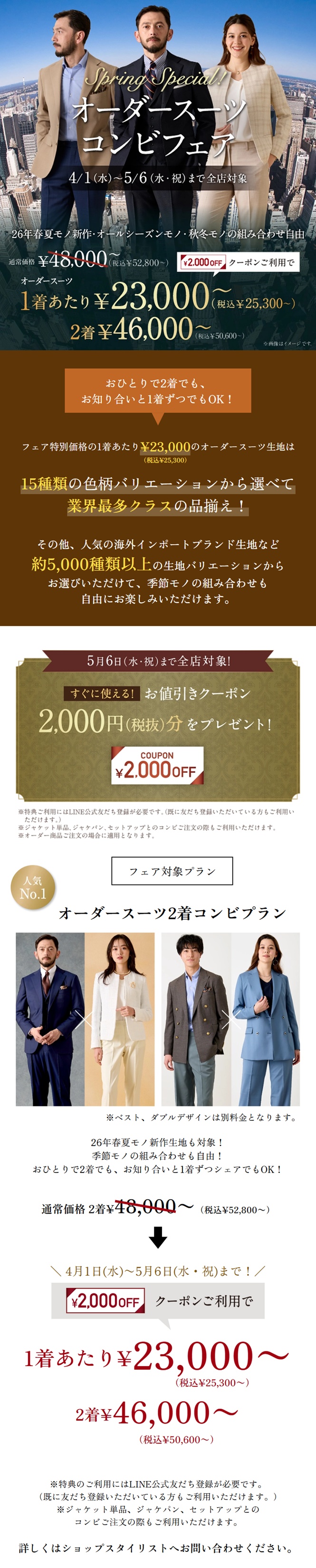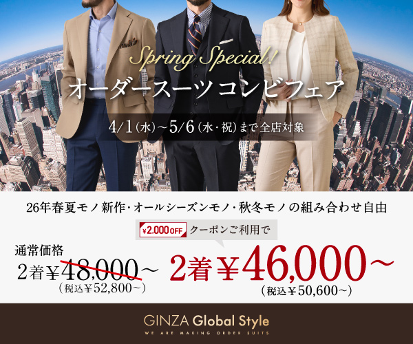 26年春夏モノ新作生地も対象で本格オーダースーツを