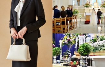 オシャレな仕上がりになるホワイトカラー×無地のスタイル。こちらは、アッシュカラーのブローチをアクセントに、セレモニーシーンでおすすめの上品なコーディネートです。