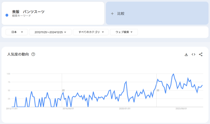 喪主や遺族の場合でも、動きやすさを重視してパンツスーツでも良いとされる場合や、多様性によりパンツスーツの需要が増えてきています。実際どのくらい需要が増えているのかGoogleトレンドの検索キーワード結果で見ていきましょう。