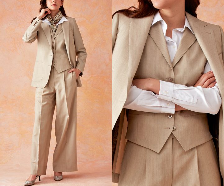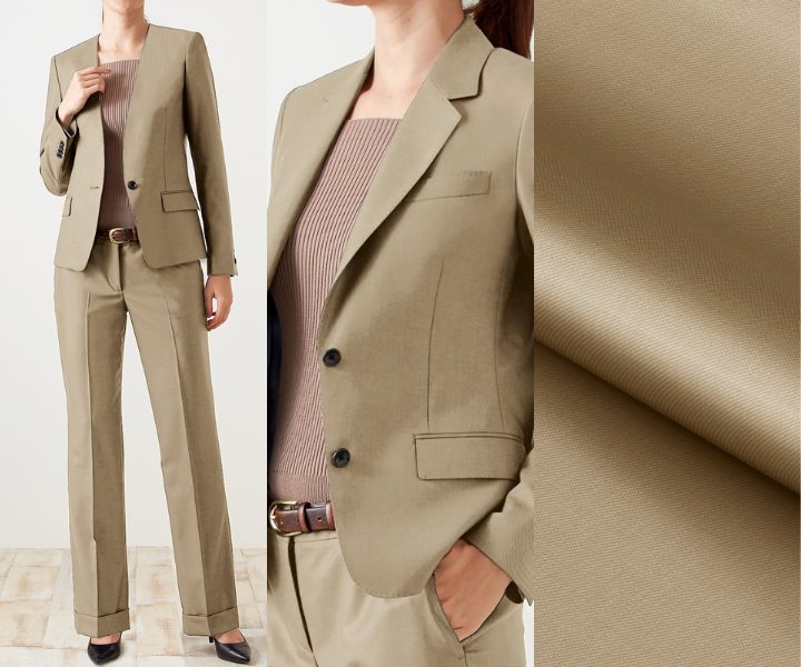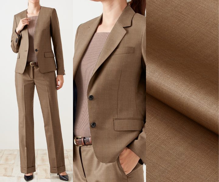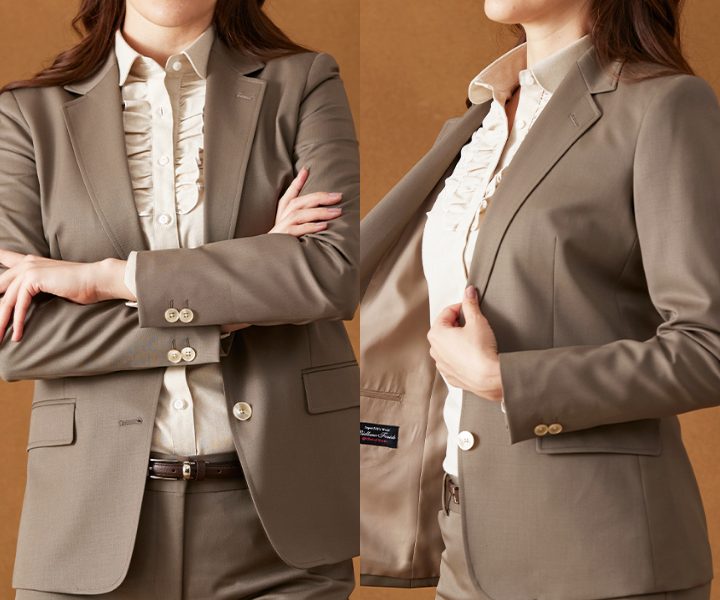 明るすぎず暗すぎない中間的なトーンのベージュは、柔らかく上品な印象と、落ち着きのある雰囲気を兼ね備えたバランスの良いカラーです。ビジネスシーンにも自然になじみ、季節を問わず着用できる汎用性の高さが魅力。インナーや小物の合わせ方によって、フォーマルにもカジュアルにもアレンジできるため、ベージュスーツが初めての方にもおすすめです。