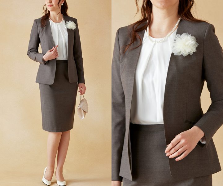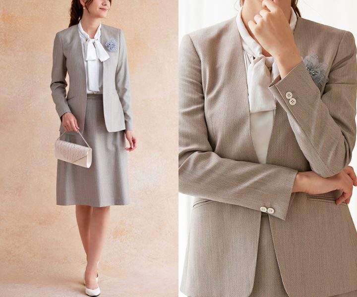 明るく柔らかな印象のライトベージュスーツは、セレモニーにふさわしい華やかさがあります。ノーカラージャケットとセミフレアスカートの組み合わせが、上品な軽やかさを演出。インナーや小物をホワイトやシルバーなど明るいカラーでまとめることで清潔感が際立ち、入園式・入学式などのハレの日を美しく彩るコーディネートが完成します。