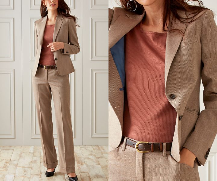 やや赤味を帯びたトーンのベージュスーツは、上品で清潔感のある印象を演出します。テーラードジャケットとセミフレアパンツの組み合わせは、すっきりとしたシルエットながら、どこか親しみやすさも感じられるスタイルです。同系トーンのインナーを合わせることで統一感が生まれ、オフィスカジュアルに最適なコーディネートに仕上がります。