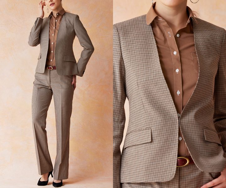 ベージュのマイクロチェック柄スーツに、同系色のブラウンシャツを合わせた上品なカジュアルコーディネートです。程よい個性と柔らかさを感じさせる配色で、親しみやすくこなれた雰囲気があります。カジュアル感のあるチェック柄も、落ち着いた色にまとめることで全体が引き締まるので、オフィスカジュアルとしてもおすすめです。