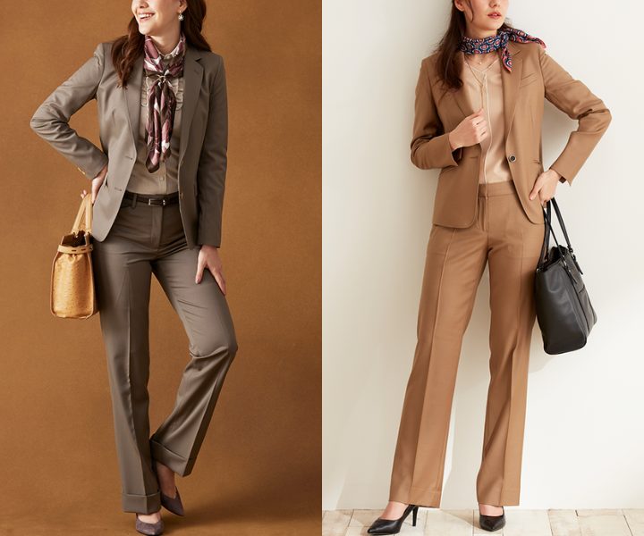 上品で温厚な印象を与えるベージュのレディーススーツ。明るく優しい色合いながらもきちんと感があり、ビジネスシーンはもちろん、セレモニーやお出かけにも活躍する人気のアースカラーです。