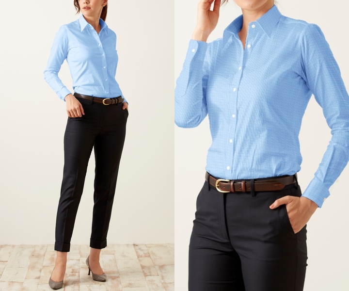 爽やかなサックスブルーのシャツが夏らしい軽やかさを演出。ジャケットなしでも清潔感があり、オフィスにふさわしいきちんと感をキープできます。ベーシックなブラックパンツを合わせることで、すっきりと引き締まった印象に。暑い季節でも快適に過ごせるコーディネートです。