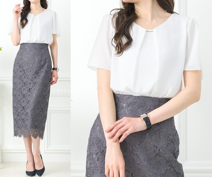 女性らしさや柔らかい印象を出したいときはスカートスタイルがおすすめです。素材や丈感に配慮しながら、夏らしい軽やかさも意識すると良いでしょう。