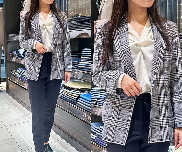 落ち着いたトーンの組み合わせながら、チェック柄が程よい華やかさを添えるコーディネートです。ネイビーパンツで下半身を引き締めることで、全体のバランスが整い、スタイルアップも期待できます。知的で信頼感のある印象に、さりげない個性が感じられる着こなしです。