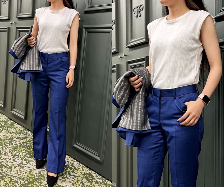 爽やかなブルーパンツに、シンプルなホワイトカットソーを合わせた夏らしいオフィスカジュアルスタイルです。明るいトーン同士の組み合わせが、軽やかで開放感のある雰囲気を演出します。さらにカットソーの程よい抜け感が、リラックス感と清潔感を両立し、きちんと見せつつも涼しげな印象を与えてくれます。