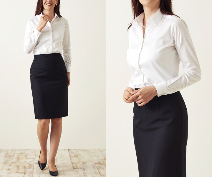 シャープな印象のホワイトシャツに、引き締め役のブラックスカートを合わせた王道スタイルです。シンプルながらも清潔感ときちんと感を両立できます。オフィスカジュアルでもフォーマル寄りの印象を求める方におすすめです。堅くなり過ぎないように小物で抜け感を加えるのも良いでしょう。