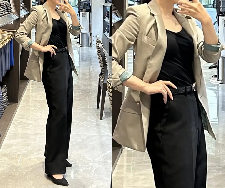 柔らかさと落ち着きを兼ね備えたベージュのジャケットは、程よく華やかで親しみやすい印象に。ブラックパンツを合わせることで、コーデにメリハリが生まれ、バランスの良い着こなしが完成します。季節感もあり、ビジネスからカジュアルまで幅広く活躍する万能コーデです。