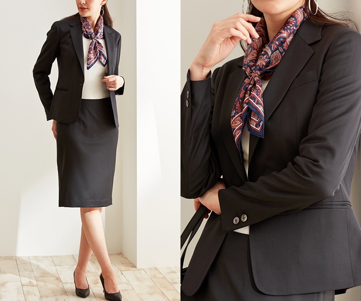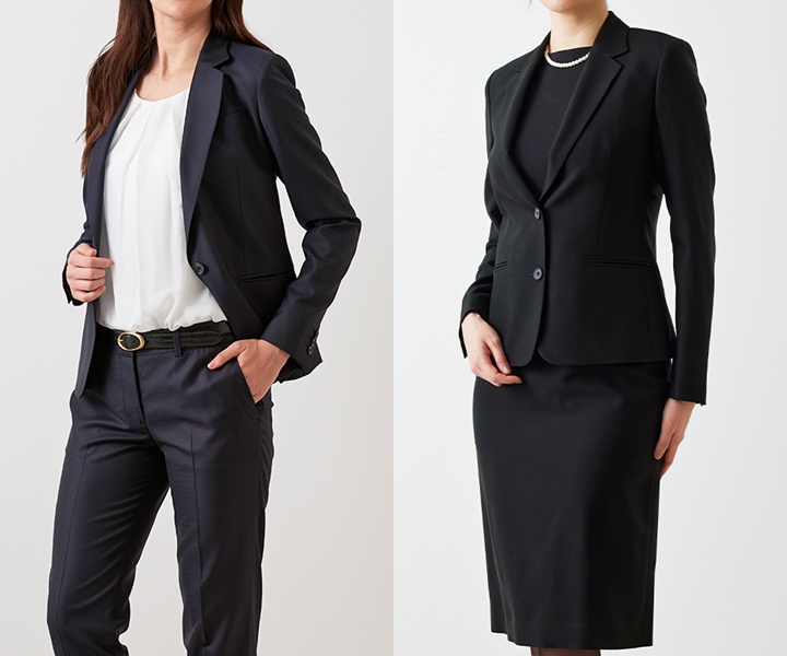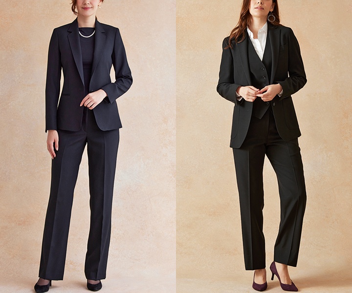 パンツスタイル(パンツスーツ)も、動きやすさと落ち着いた印象を兼ね備えているため、最近女性への人気が高まっています。ストレートパンツ・テーパードパンツ・ワイドパンツと、シルエットの選択肢が豊富で、好みや体型に合わせて選べるのも魅力です。特に40代以降の女性を中心に、体型をカバーしつつ快適に着用できる点で人気があります。また防寒性が高く、季節を問わず使いやすいのもメリットです。快適性ときちんと感を両立したい方は、パンツスタイルがおすすめです。
