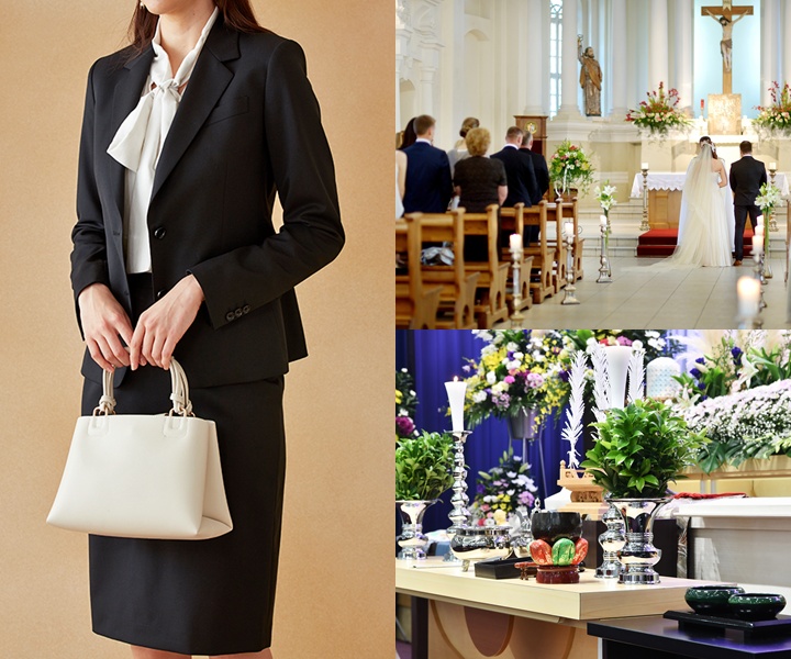 式典やパーティーなどの慶事では、格式を保ちつつも華やかさや女性らしさを演出するブラックフォーマルが理想です。明るめの素材や控えめな光沢感を取り入れたデザインも着用可能なので、着こなしの幅が広がります。