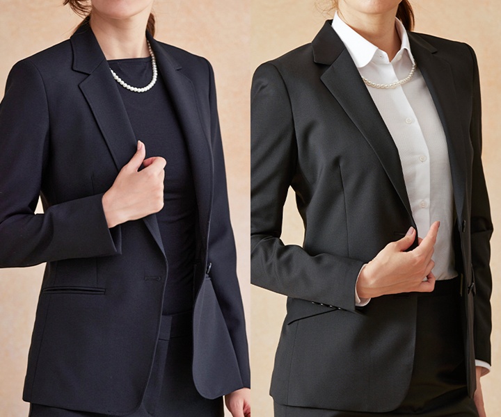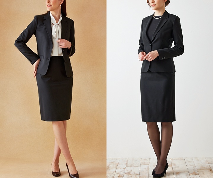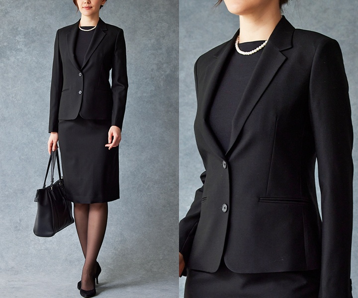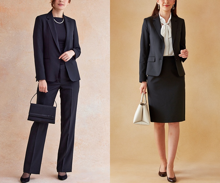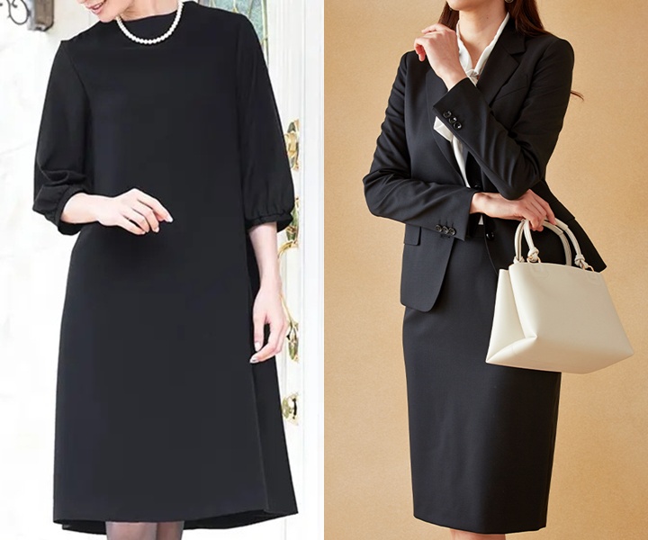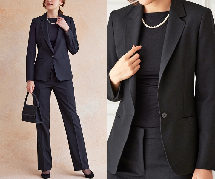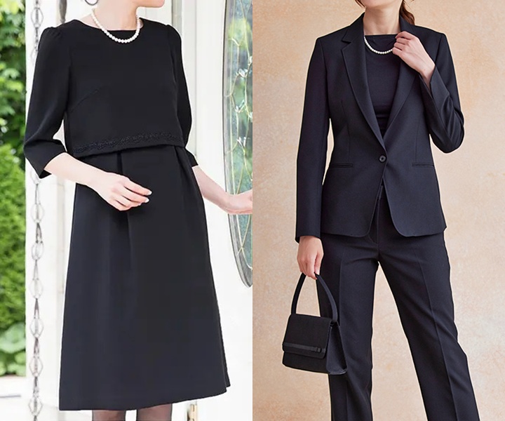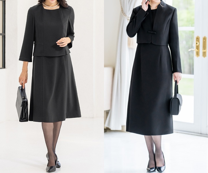 喪服はブラックフォーマルの一種で、特に弔事の場で着用される最も格式の高い礼服です。ブラックフォーマルは冠婚葬祭全般に対応できる正装ですが、その中でも喪服は葬式やお通夜、法要などの弔事に限って着用されます。喪服は深い黒の色味で、光沢を抑えた素材が使われており、装飾も控えめです。一方同じブラックフォーマルでも、慶事に使われるものは、やや光沢のある素材や柔らかいシルエットが特徴で、控えめながらもデザイン性が取り入れられている場合があります。ブラックフォーマルはシーンに応じて使い分けることがポイントです。(画像左:ブラックフォーマル、画像右:ブラックフォーマル兼喪服)