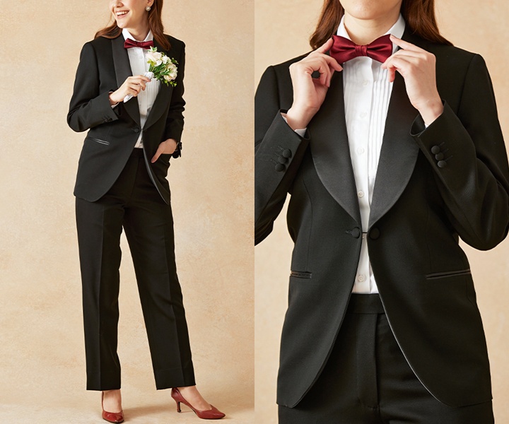 深みのあるブラックのワイドパンツスタイルに、ホワイトシャツを合わせた気品のある着こなしです。首元にボルドーの蝶ネクタイを合わせることで、華やかさと個性をプラス。メンズモデルでゆったりとしたシルエットのパンツなので、格式を保ちながらも動きやすく、立ち座りの多い場面でも安心して着用することができます。