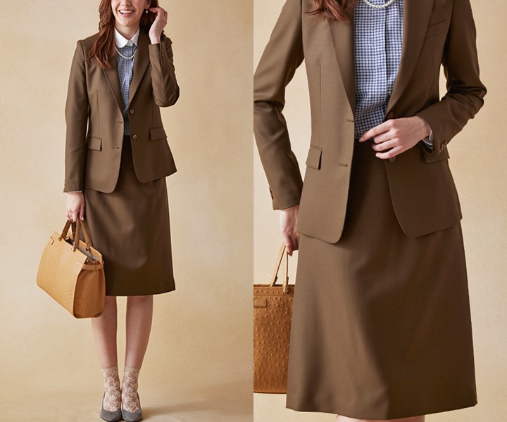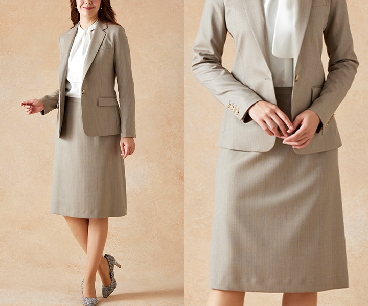 ベージュのヘリンボーン柄スーツにセミフレアスカートを合わせた秋冬向けスタイルです。温かみのある色合いが季節感を演出しつつ、ジャケットとスカートのセットが落ち着いた印象を与えてくれます。さらにホワイトのタイブラウスが華やかさを添えるため、ビジネスシーンでも上品な雰囲気を保ちつつ、快適に着用できるでしょう。