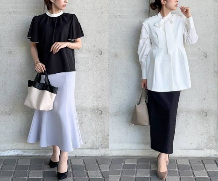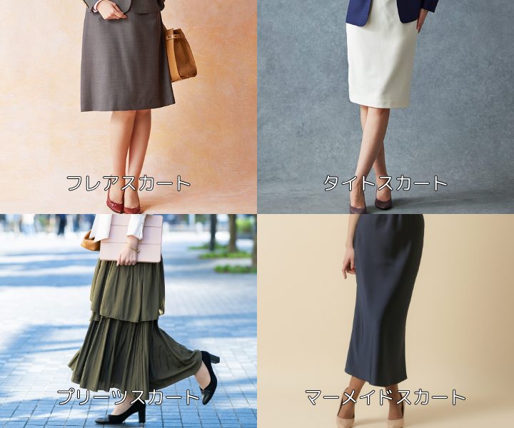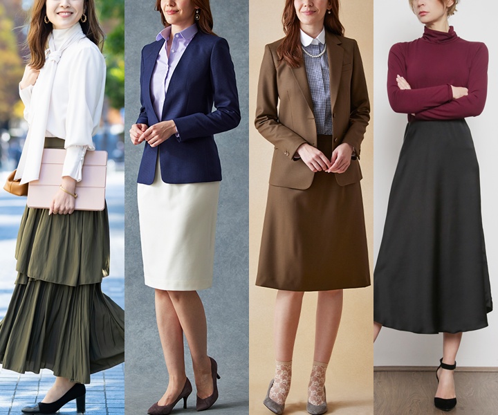 スカートを使ったコーディネートは、合わせるアイテムによっても雰囲気が大きく変わります。オフィスカジュアルでは、アイテムを工夫してバランスの取れた着こなしを目指しましょう。