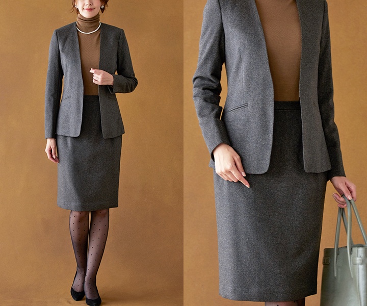 起毛感のあるグレーのノーカラージャケットに、タイトスカートを合わせたシンプルなスタイルです。秋冬のオフィスに最適な落ち着いたグレーは、上品な印象を与えてくれます。さらにブラウンのタートルネックニットが、温かみと季節感をプラス。堅すぎず柔らかすぎないバランスの良さが魅力の秋冬向けコーディネートです。